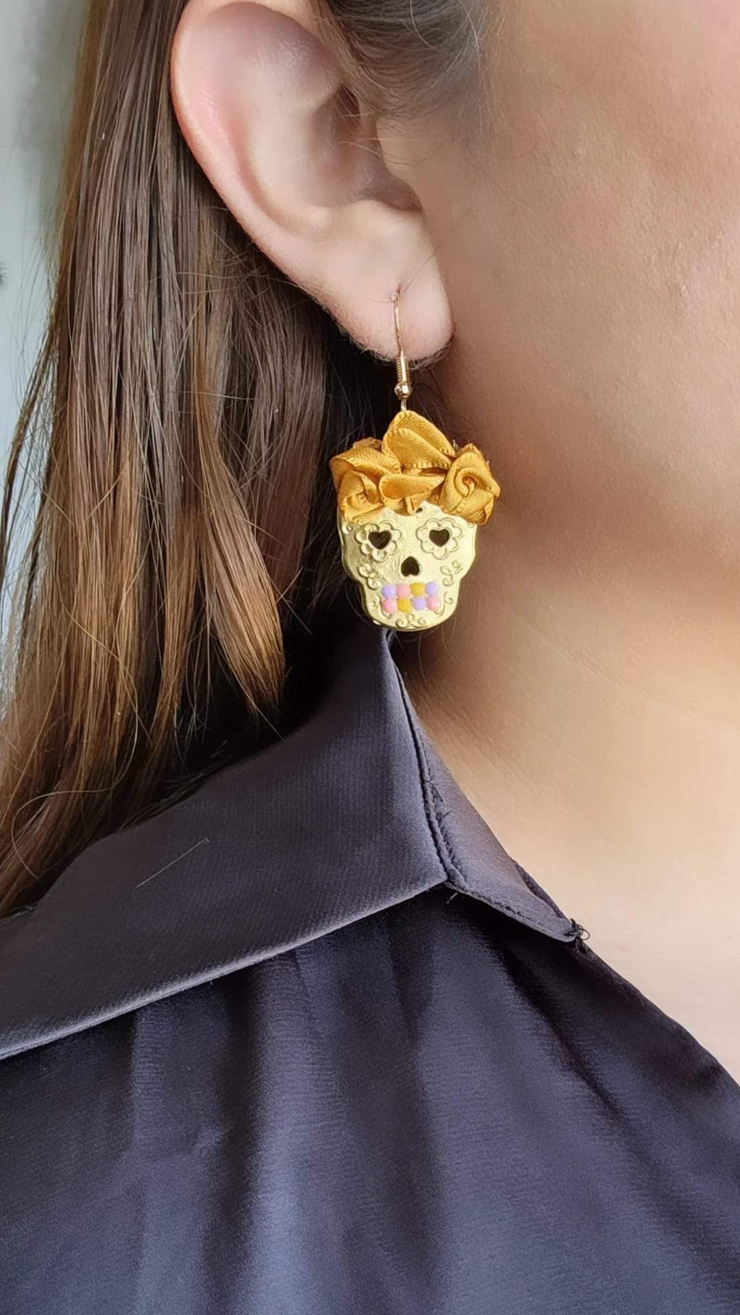 Aretes con diseño de cráneo chapados en oro 14k con pedrería colorida y flores de listón dorado elaborados a mano.