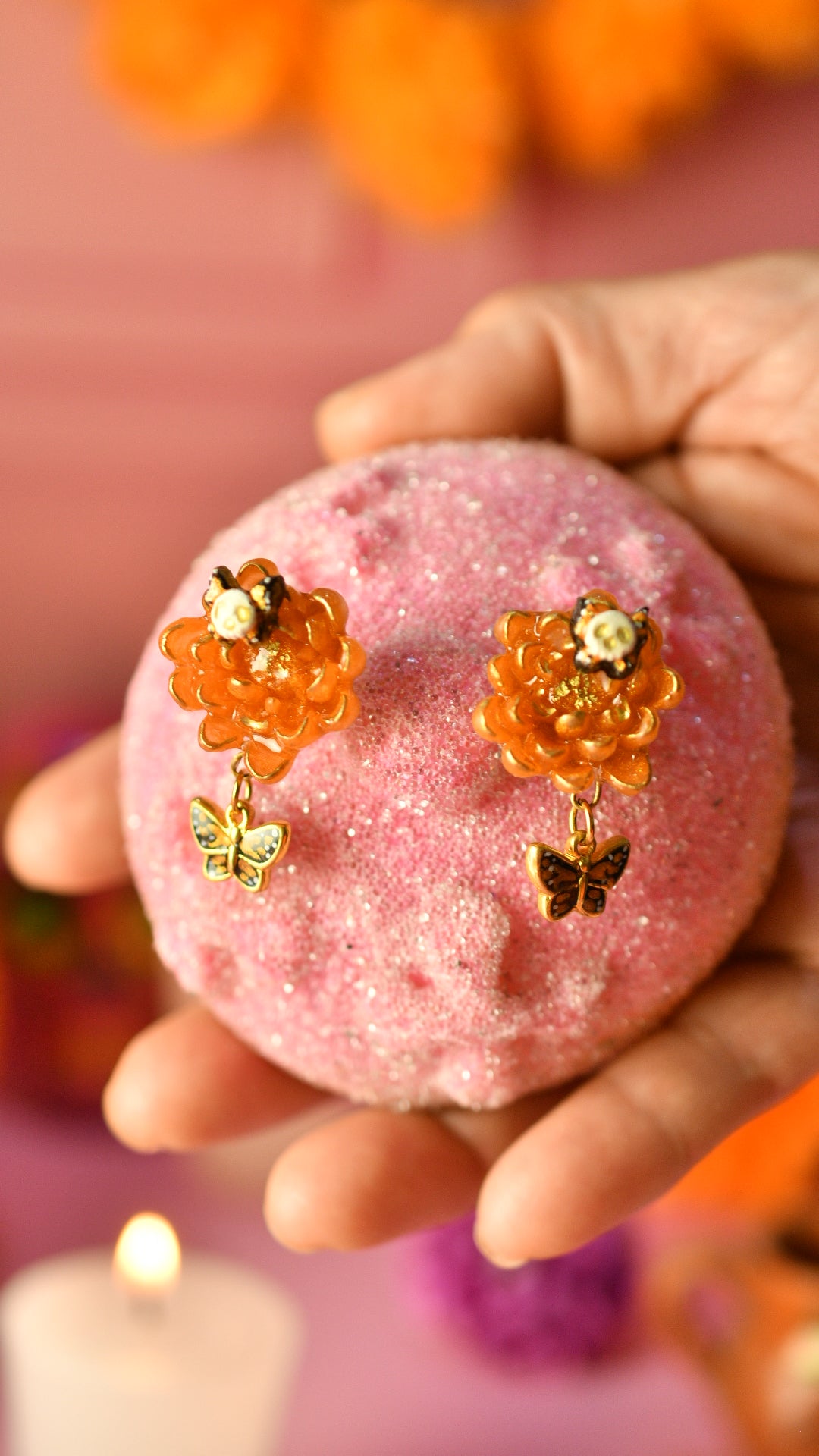 Aretes elaborados de resina, dijes chapados en oro pintados a mano.
