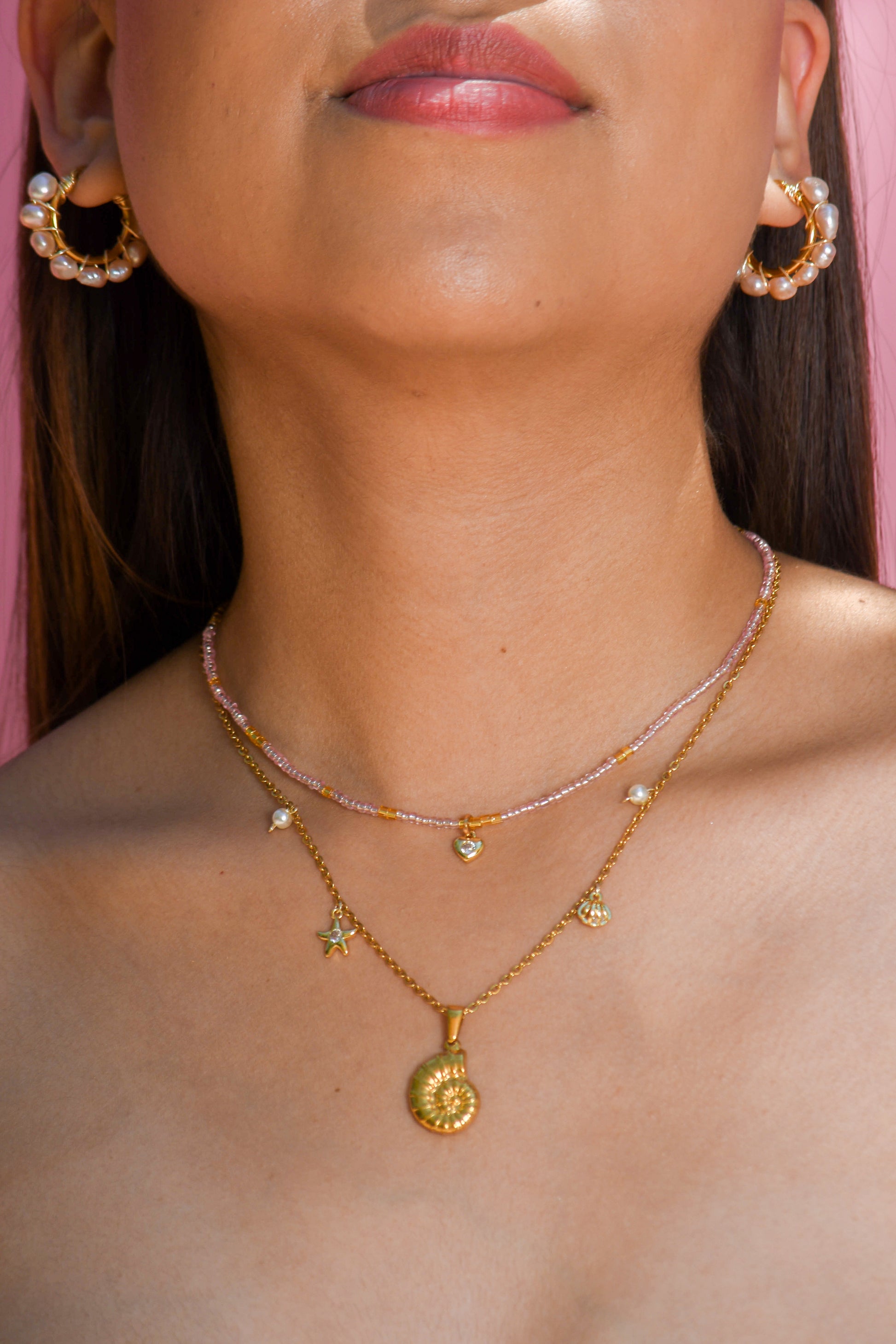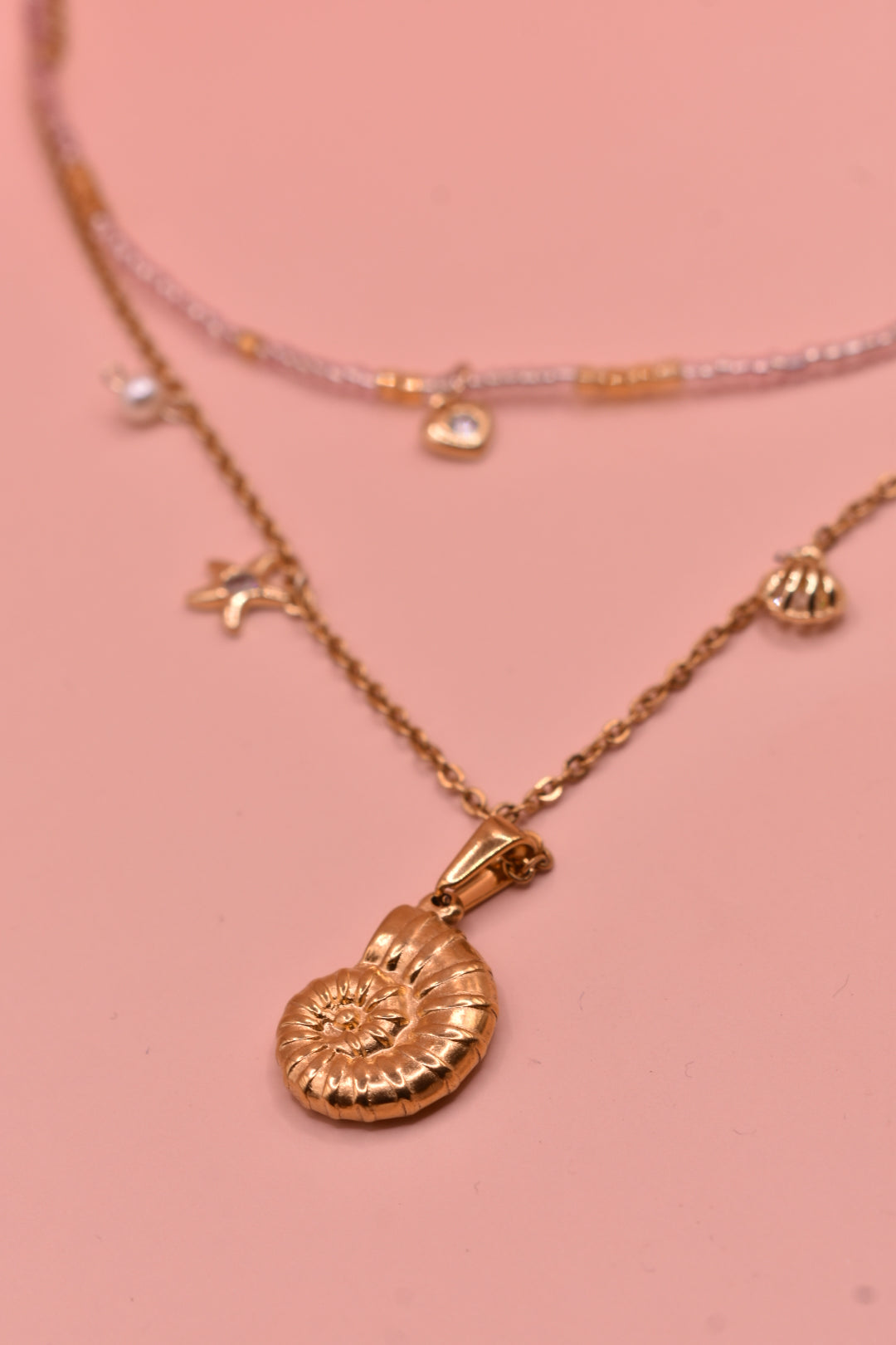 Layer de acero inoxidable, perlas artificiales y cristales con dijes en chapa de oro y zirconias