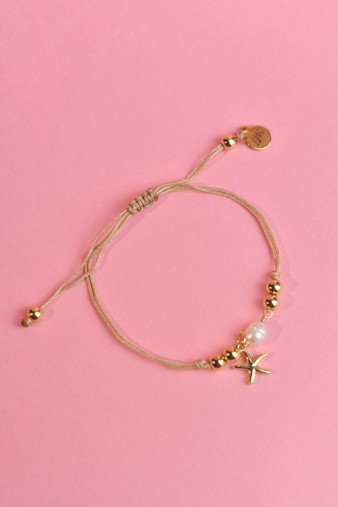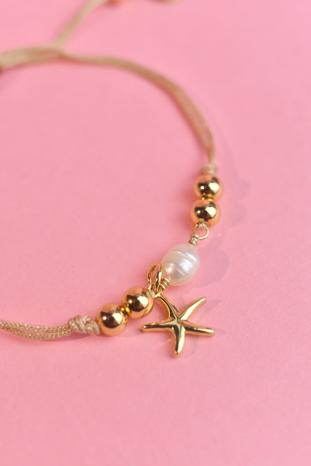 Pulsera elaborada con hilo y cuentas chapadas en oro 14k y perlas cultivadas.