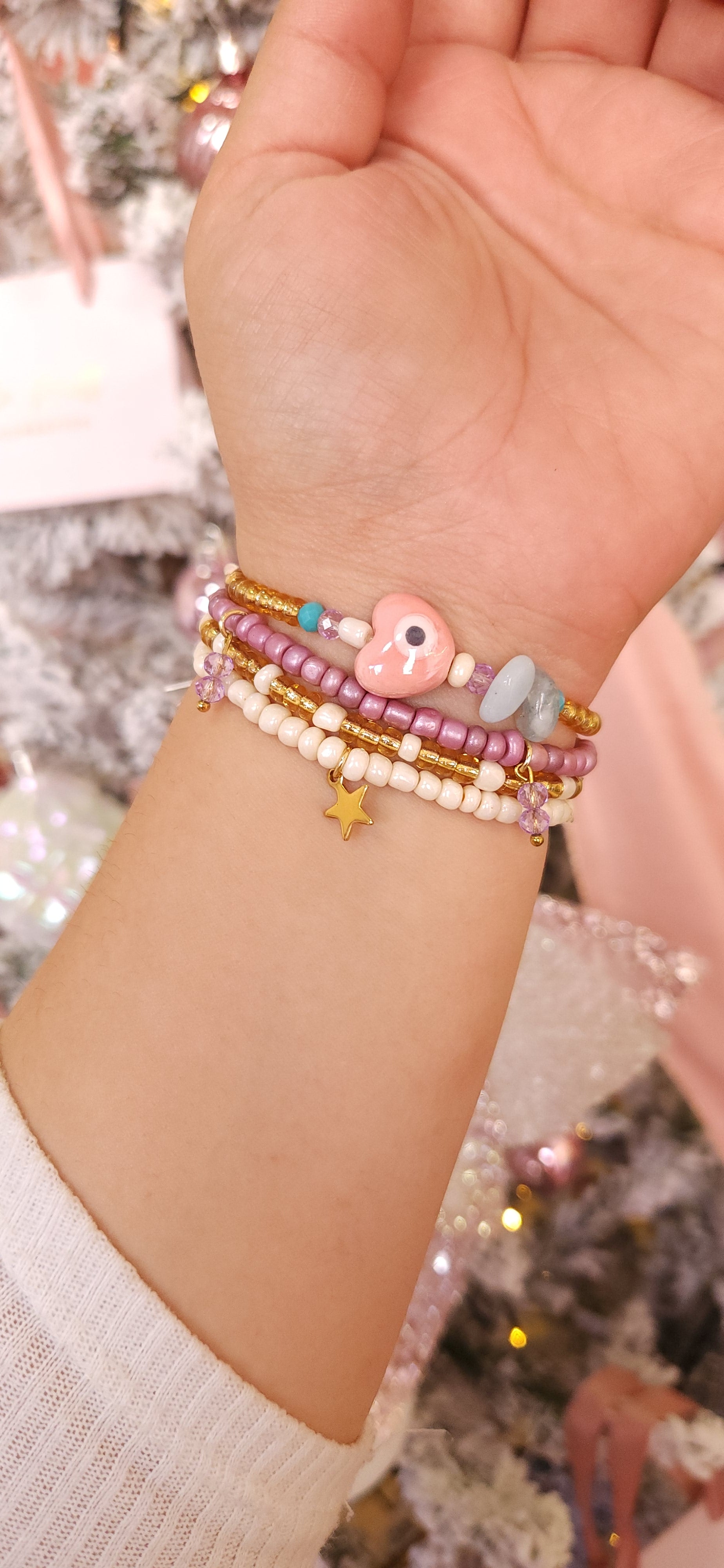 Set de pulseras de cuentas de cristal con dijes de ceramica, cristales, cuarzos y acero inoxidable.